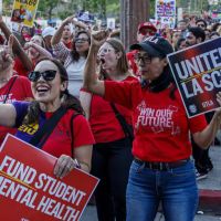 LAUSD stares down historic walkout as negotiations continue ![]() LAUSD stares down historic walkout as negotiations continue Los Angeles’ public schools could be closed beginning Tuesday morning if three school district unions go on strike. The three major unions represent teachers, most non-teaching staff and school administrators. In a solidarity pact, they agreed to honor the picket line of any union that had not reached a tentative agreement ahead of Tuesday, April 14. Two of the three unions — United Teachers Los Angeles and Associated Administrators of Los Angeles/Teamsters 2010, which represents principals and assistant principals — reached deals with the district over the weekend. But Monday evening, marathon negotiations had not yet achieved a deal with Local 99 of Service Employees International Union, which represents about 30,000 teacher aides, campus aides, gardeners, custodians, bus drivers, cafeteria workers and tech support staff. |